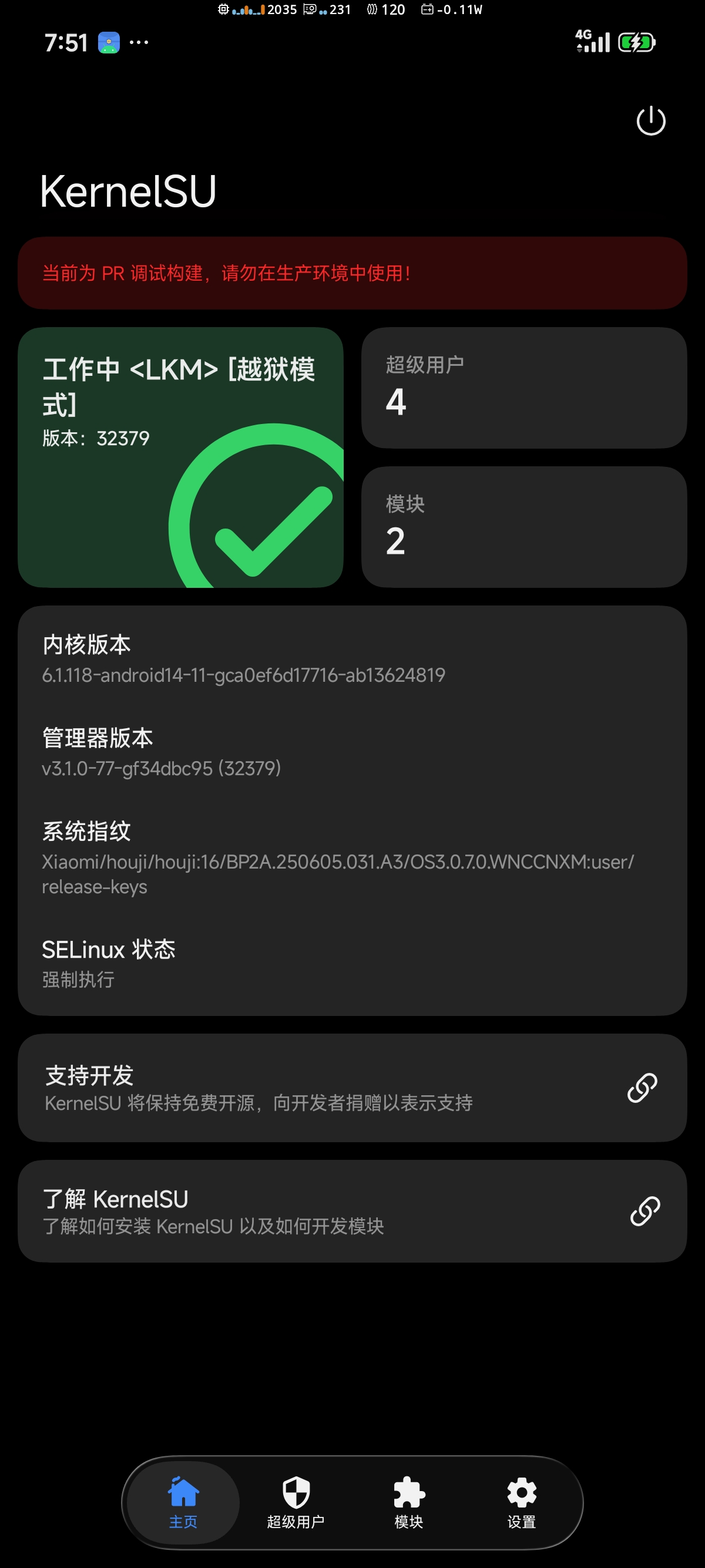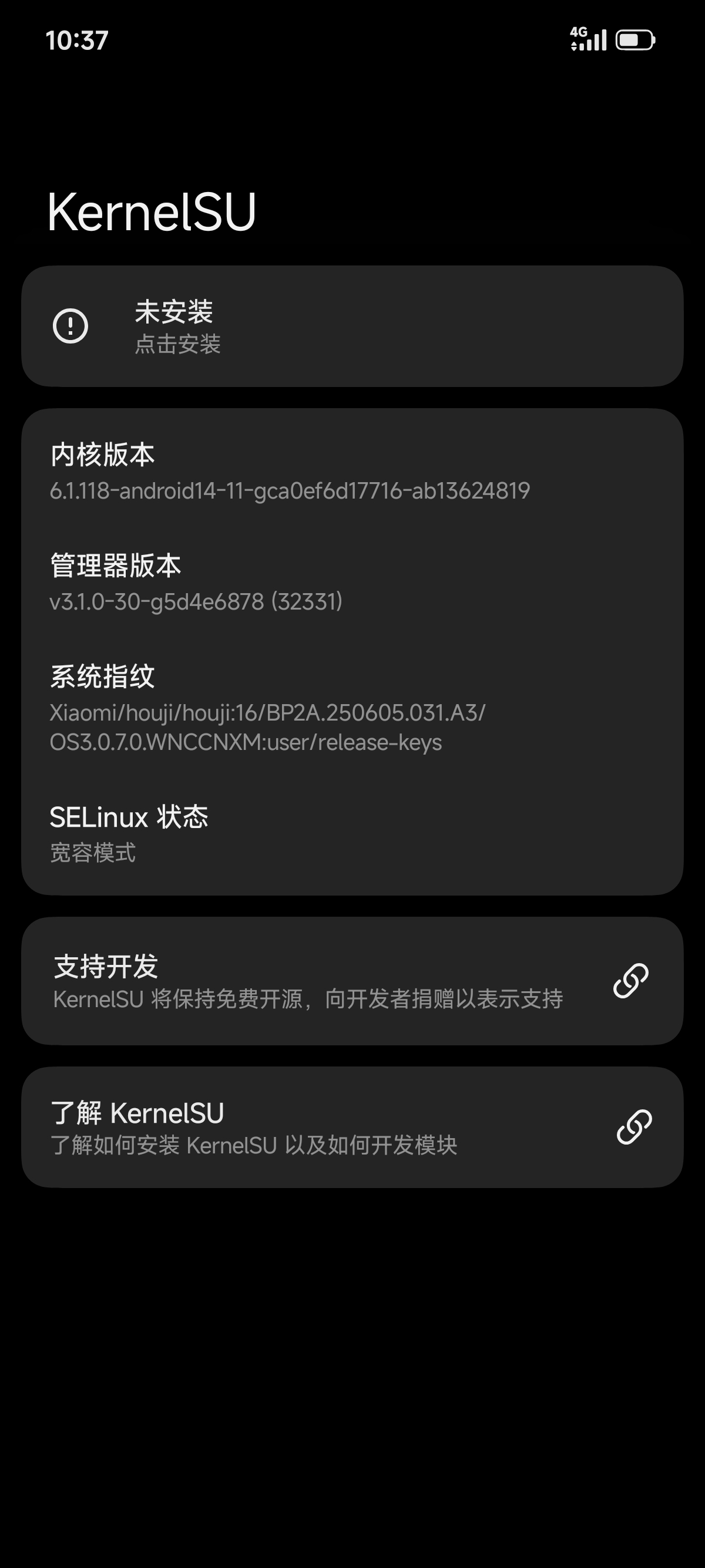 - 开机打开KernelSU,SELinux状态显示宽容模式即代表设备支持。